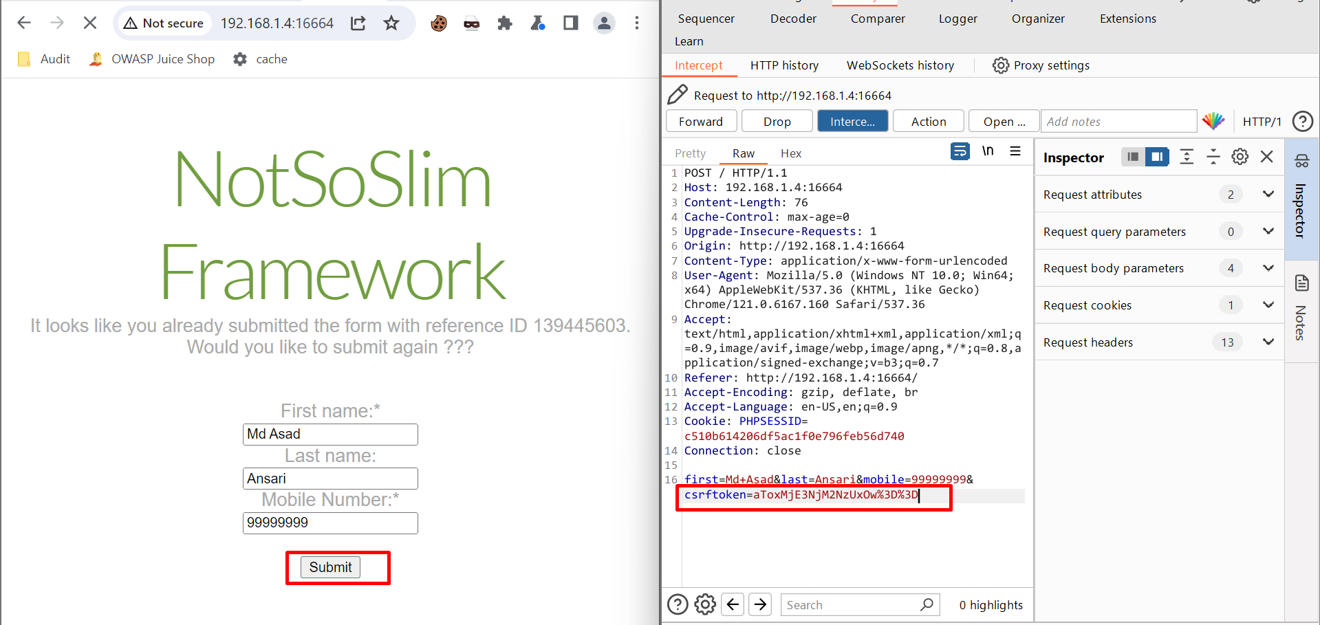 Step 2: After intercepting the signup request in Burp Suite, we examine the request parameters and notice something suspicious about the CSRF token. Instead of being a securely generated, unique value for each request, it appears predictable or improperly implemented. This could indicate a potential vulnerability, allowing us to manipulate or bypass the CSRF protection mechanism. Further analysis will help determine if it can be exploited for unauthorized actions.