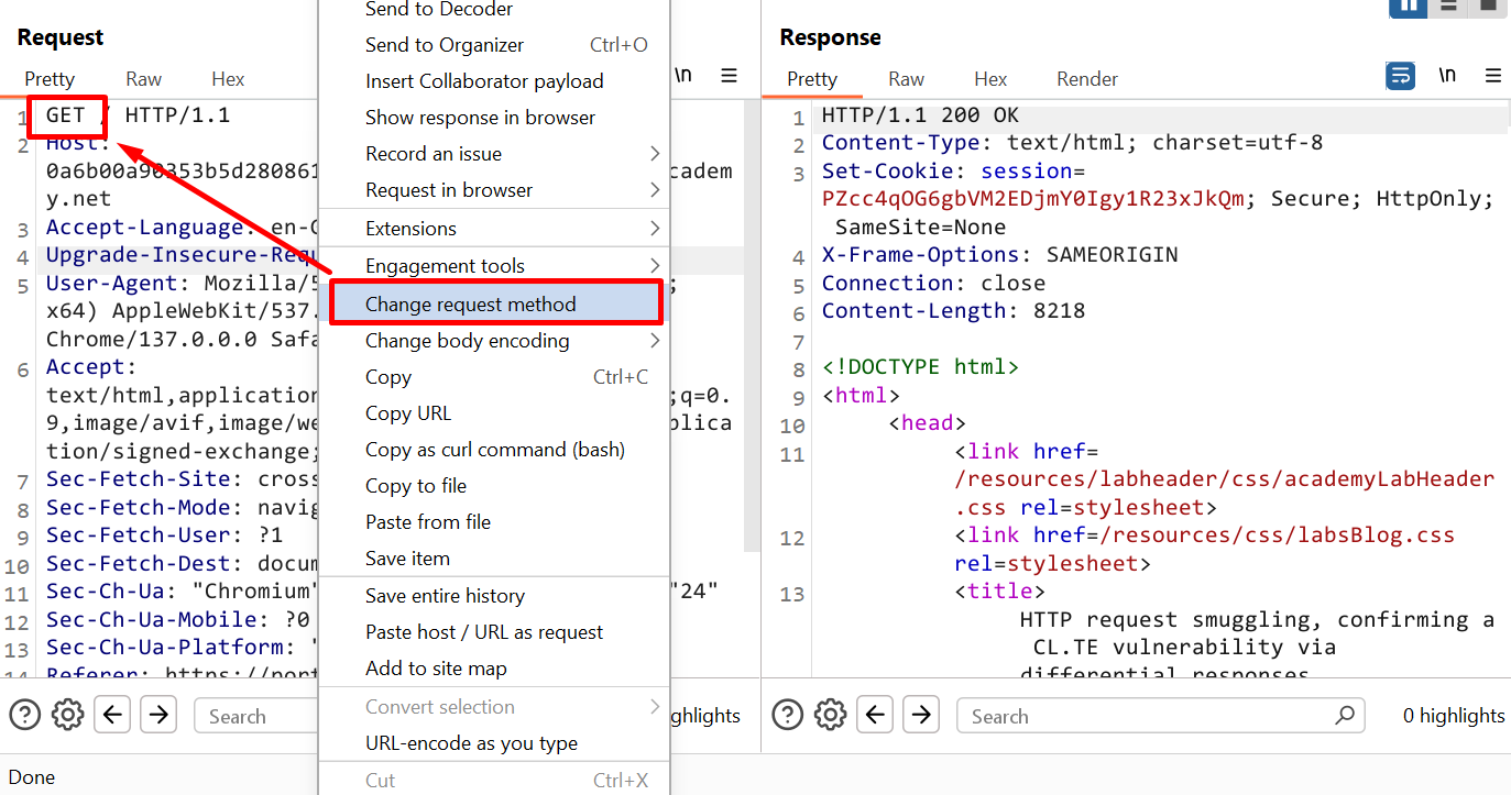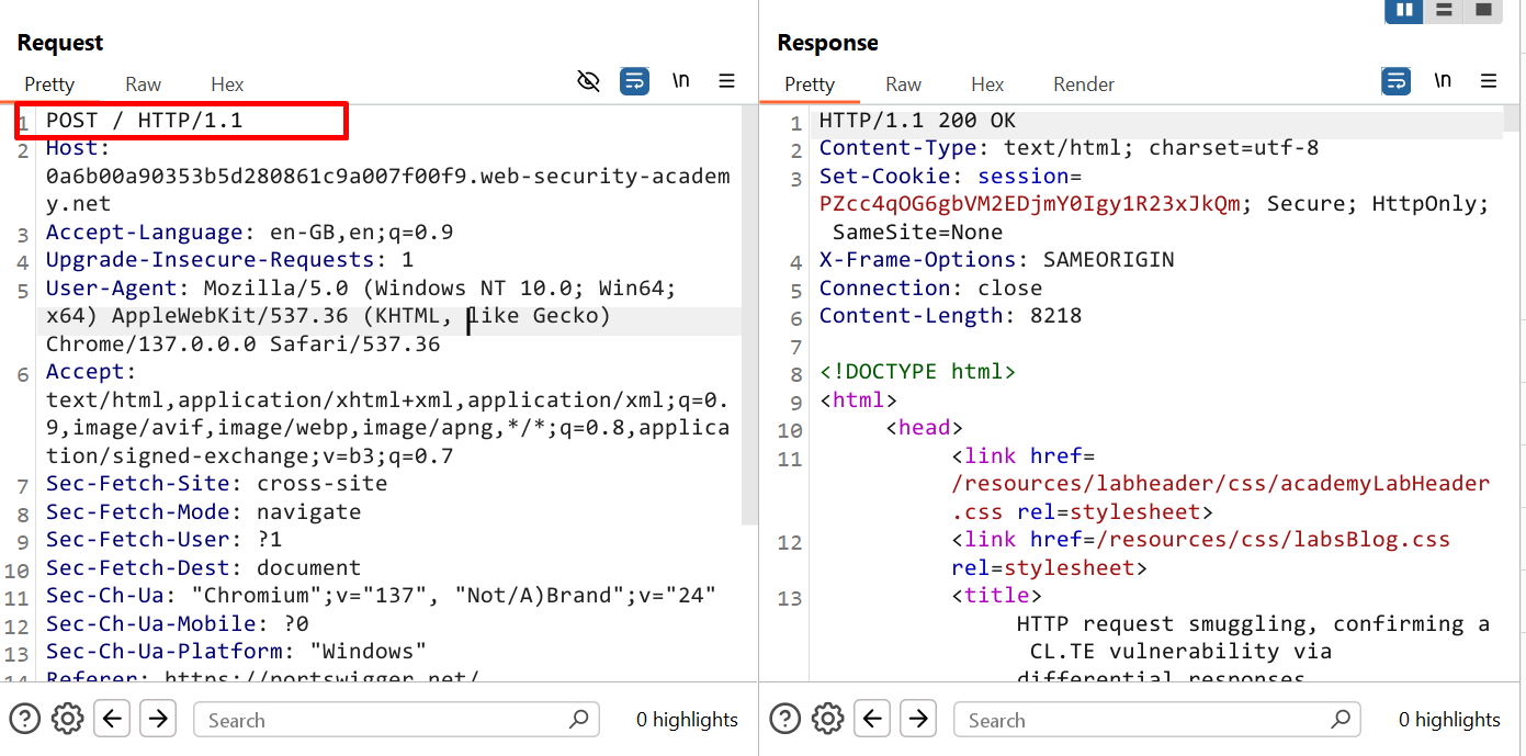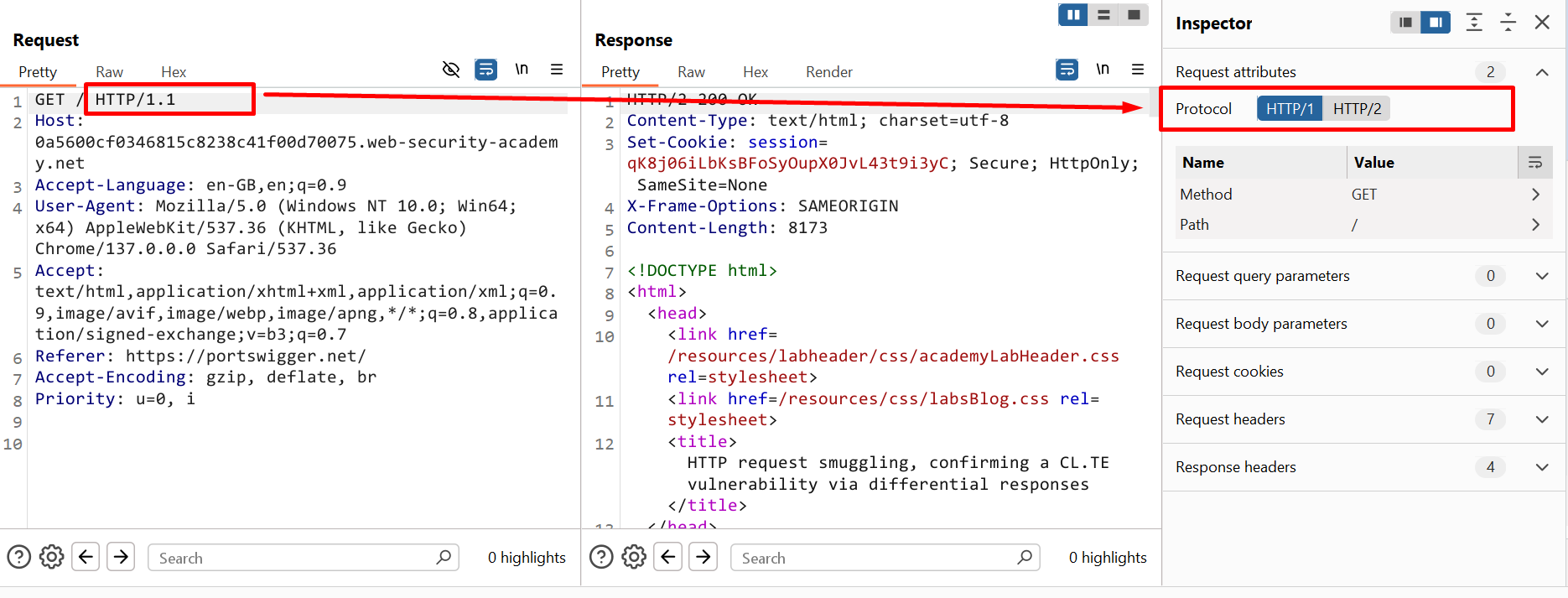 This way, the fake request sits right after the properly terminated chunked body, and we can clearly see how the front-end and backend each handle it differently during the lab test.