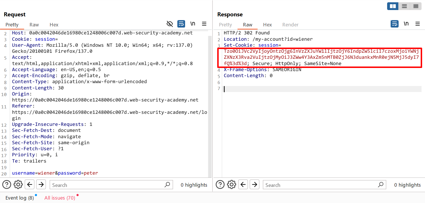 Step 1: We begin by logging in with the credentials wiener:peter and capturing the HTTP traffic in Burp Suite. This helps us analyze the request and response patterns of the web application.
