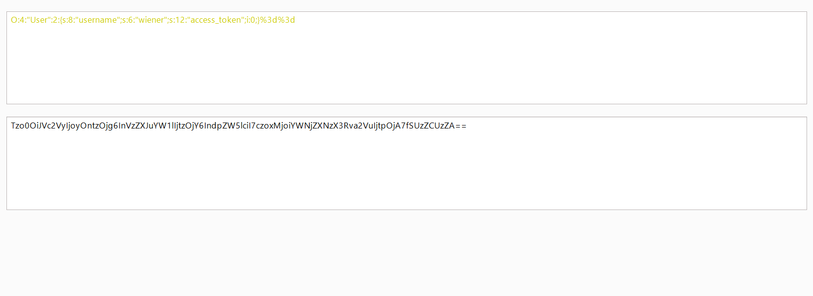 Decoded Cookie:O:4:"User":2:{s:8:"username";s:6:"wiener";s:12:"access_token";s:32:"wel8cp1fng10tf2z7wnjy12ttz3y22yw";}