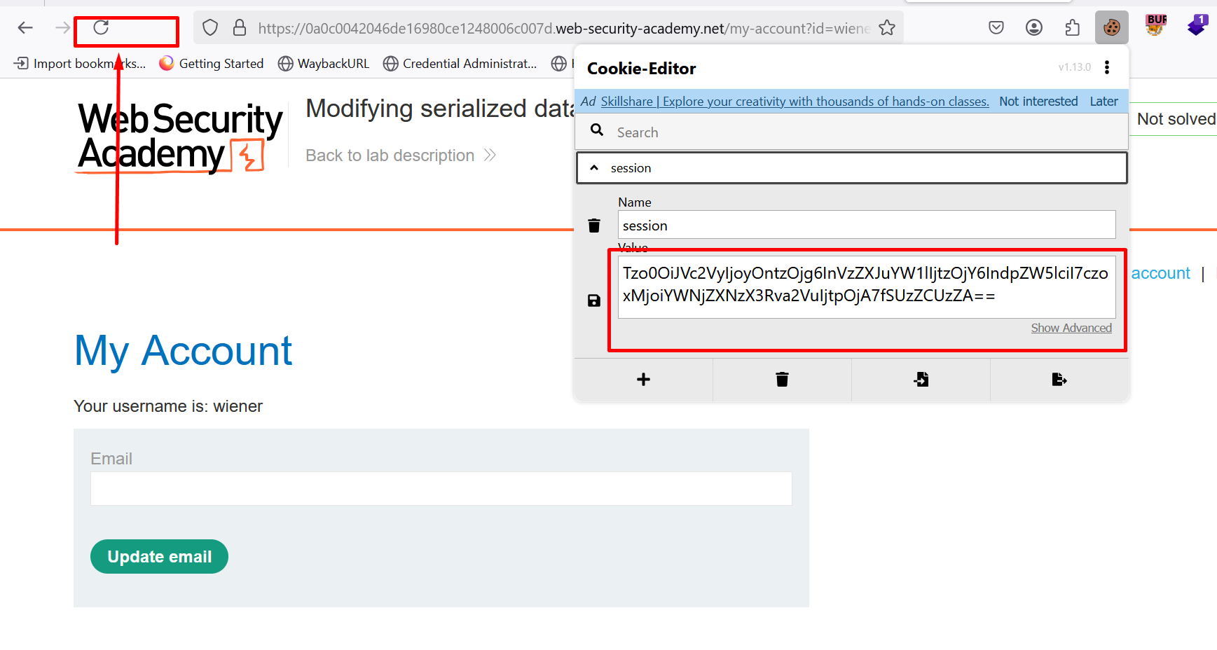 Step 5: To apply the changes, use a cookie editor extension or browser inspection tools to replace the current session cookie with the one you’ve crafted. After updating the cookie, refresh the page to observe the updated session behavior and confirm the changes are reflected.