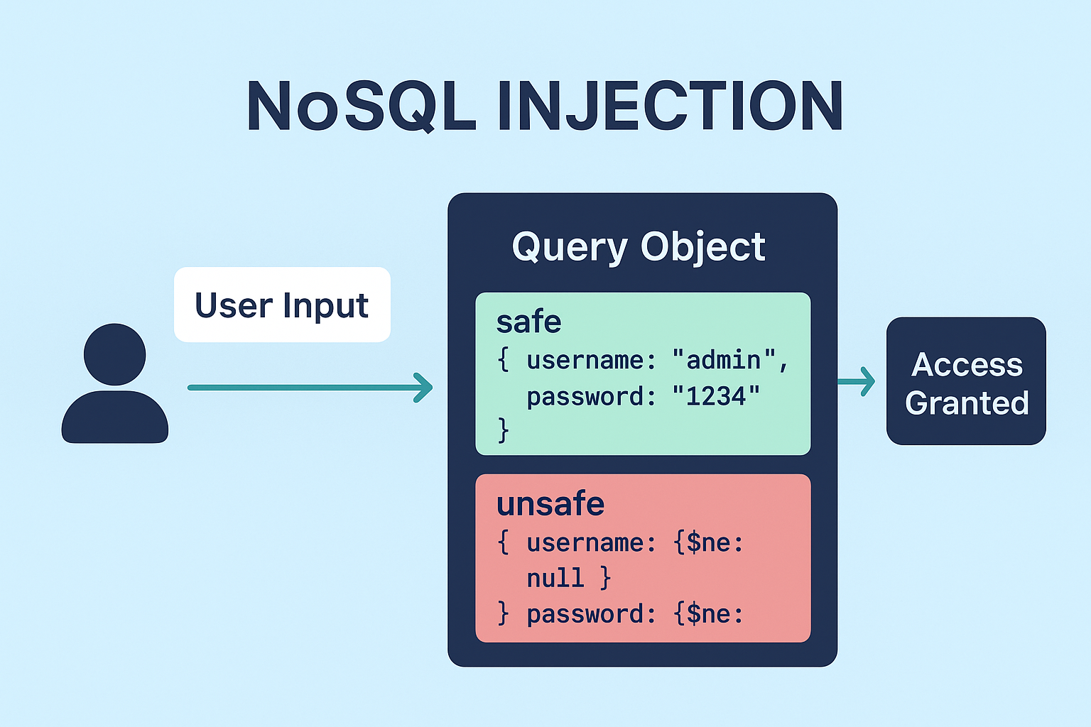 The query becomes { username: { $ne: null }, password: { $ne: null } } — which will match the first user record with non-null username/password and the attacker is in.