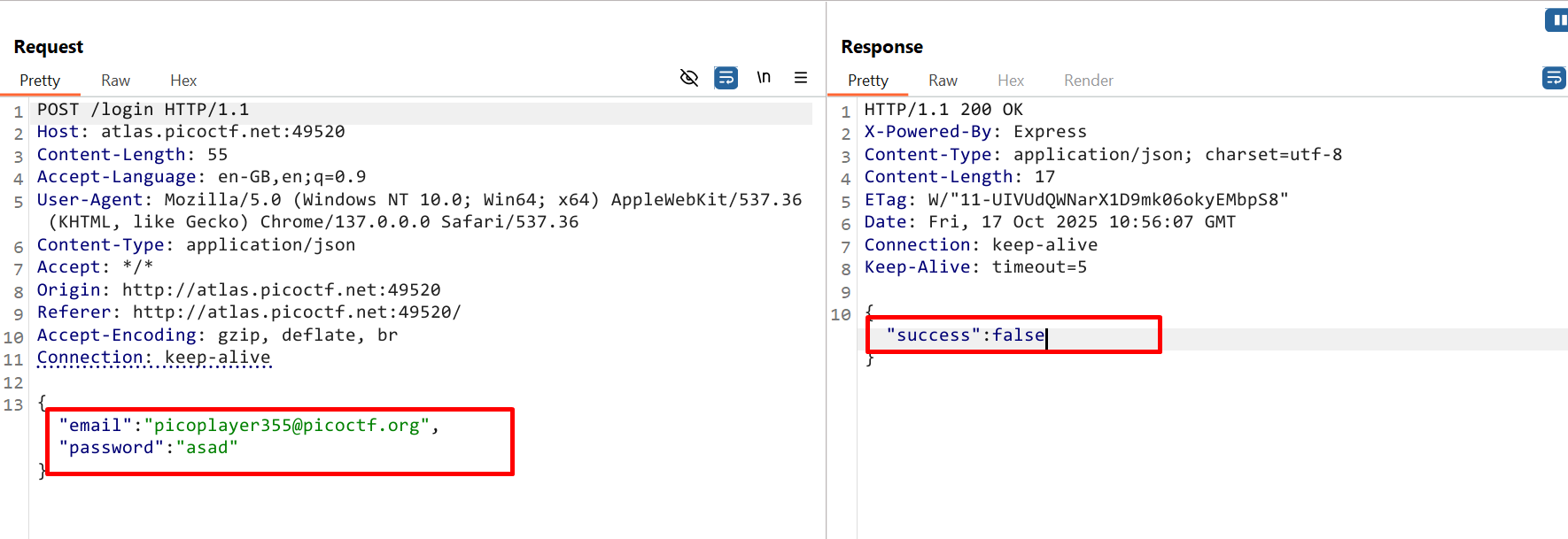 Step 2. When we tried to login with random password we got success false,