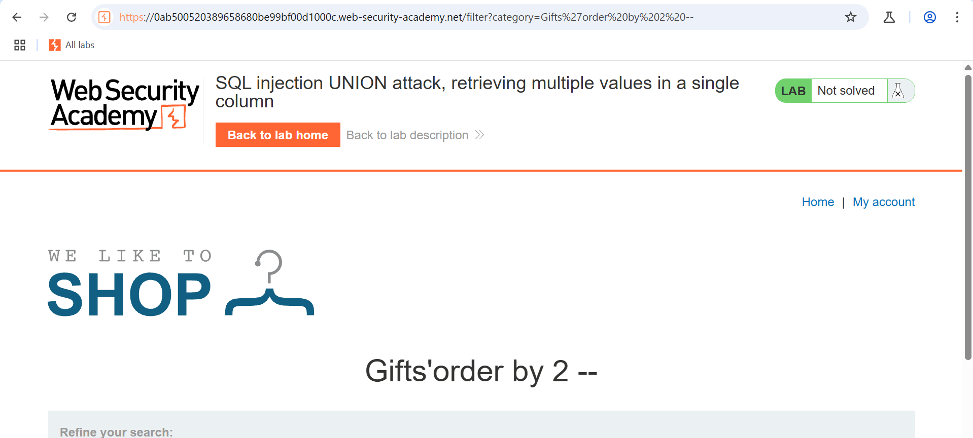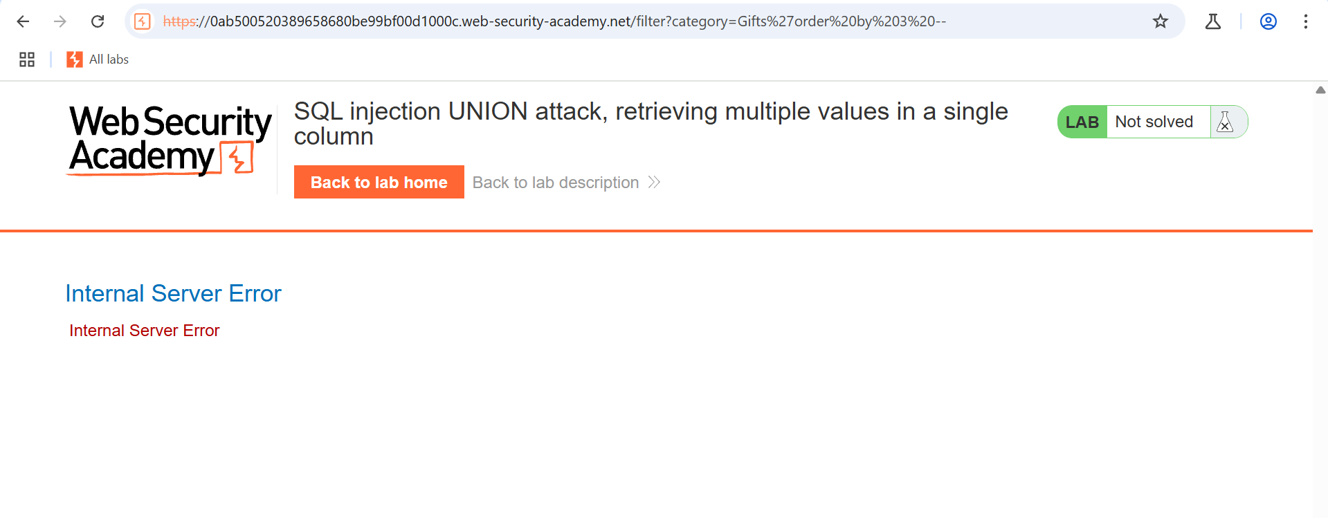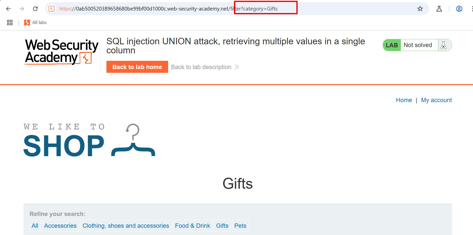 Step 1- We begin by examining the category parameter, which the lab documentation highlights as vulnerable. This parameter will serve as our entry point for the SQL injection attack.