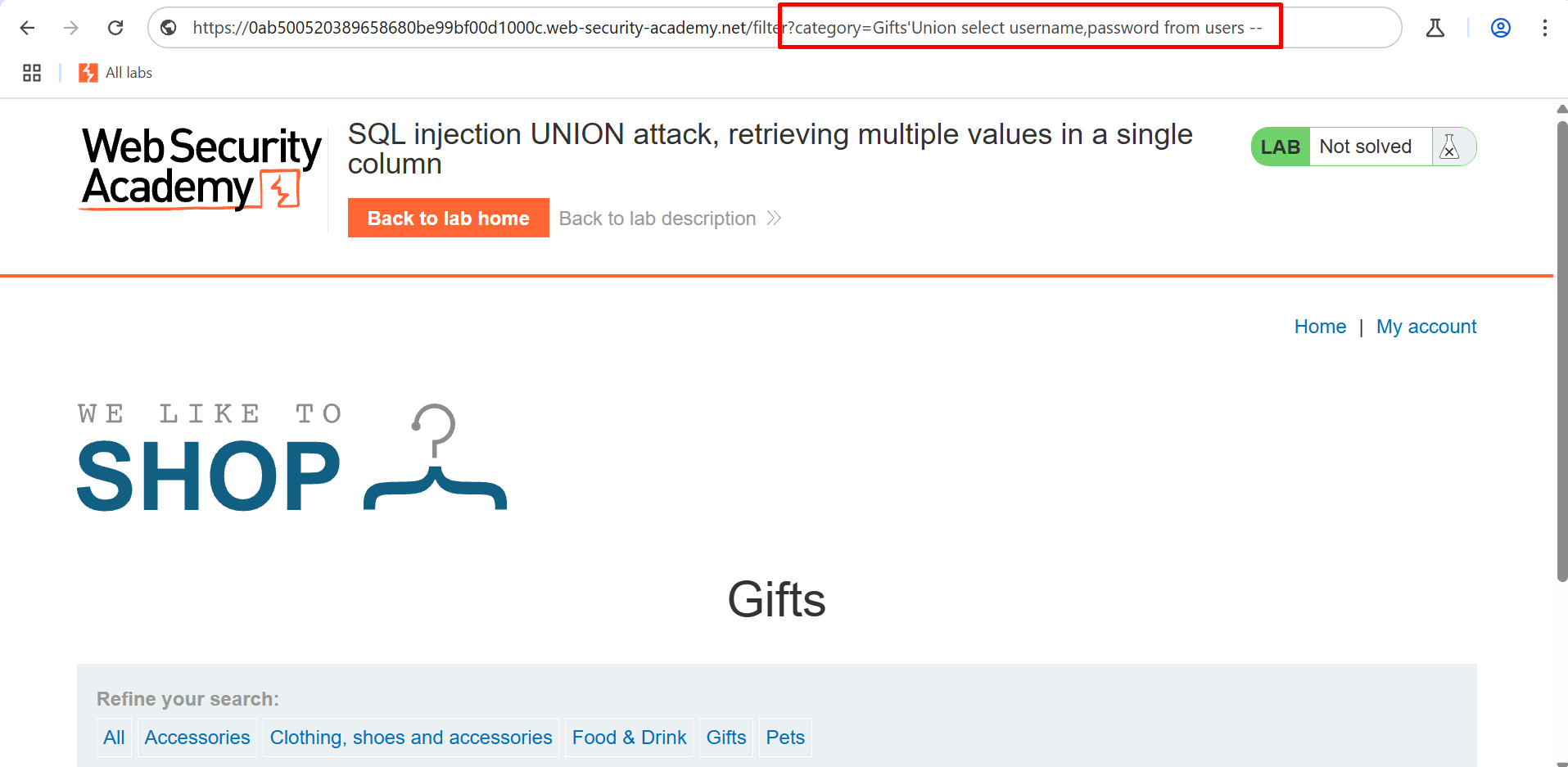 Step 12 – Now, we will craft a query to fetch both the username and password in a single column. This is the first challenge in this lab.